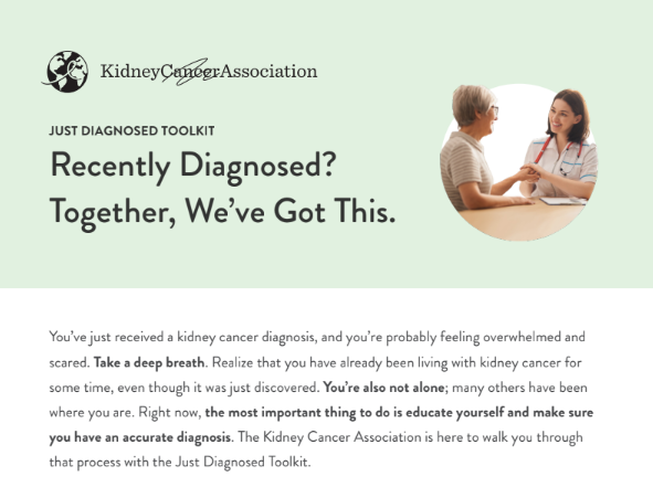 This “toolkit” walks someone who was recently diagnosed with kidney cancer through common questions and actions to take as they begin this journey.